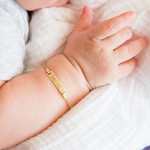 14K yellow gold Manilla or ID bracelet for kids and babies 5.5″ with an extra loop for shortening. Engraving available in block or script.