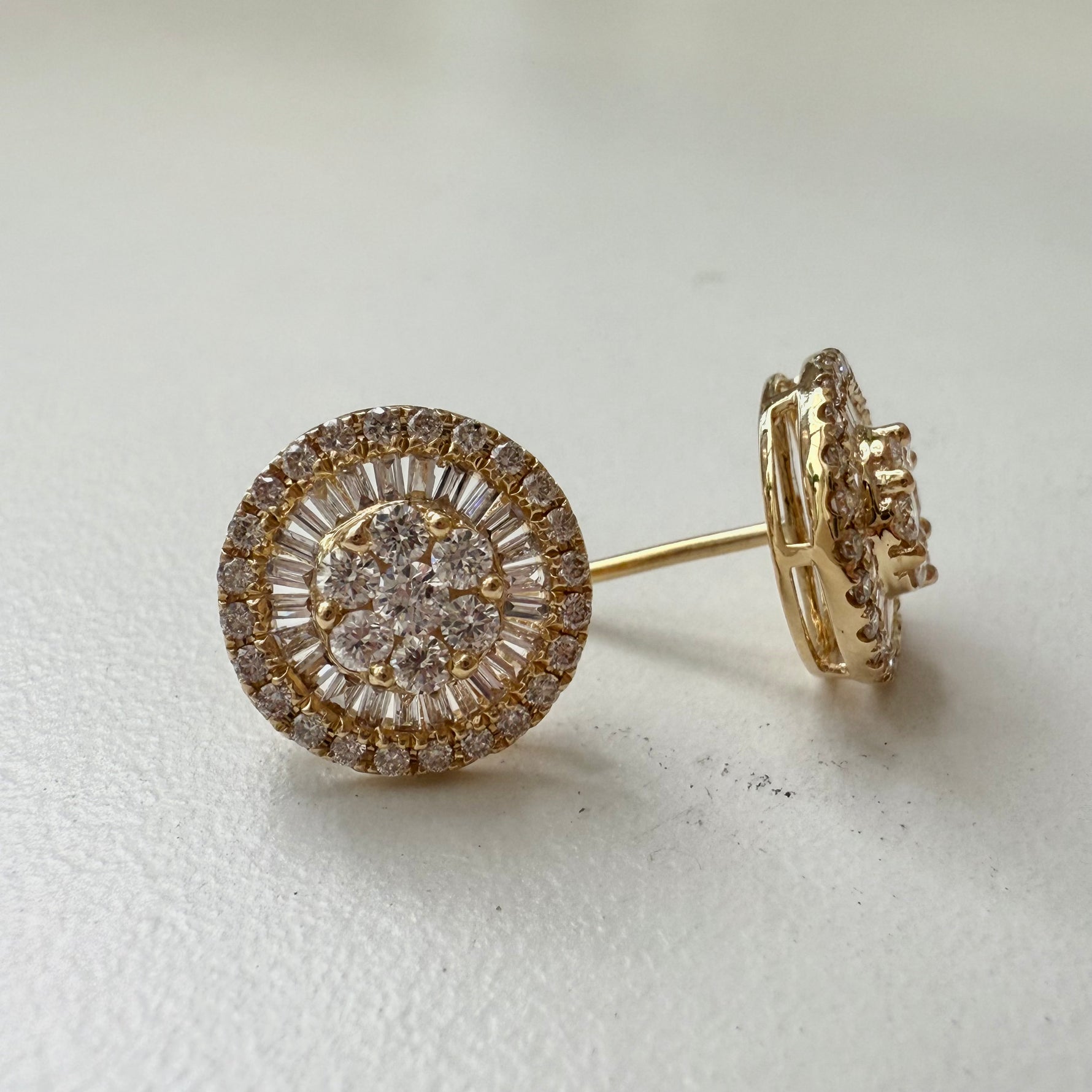 18K gold baguette and round diamond earrings available in white or yellow gold.