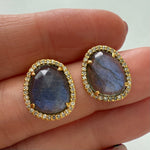 These earrings feature free-form labradorite slices, each one a miniature universe of blues and greens — no two ever the same.
