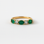 This vibrant emerald and diamond ring features 1.40 carats of green emeralds and 0.42 carats of brilliant diamonds, set in 14K yellow gold. This five-stone design balances timeless elegance with bold color.