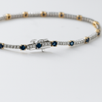 Eternal elegance meets a whisper of midnight. This exquisite tennis bracelet shimmers with alternating round sapphires and diamonds, each stone meticulously set to create a rhythm of light and color that feels both timeless and alive. The deep indigo sapphires evoke twilight skies, while the brilliant diamonds catch every flicker of light — together, they dance across your wrist with refined grace. Its secure clasp blends seamlessly into the design, ensuring this heirloom piece feels as effortless as it is precious.