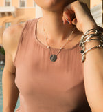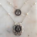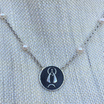 Sterling silver Caridad del Cobre pendant on silver with fresh water pearls. This coin size is roughly the size of a quarter.