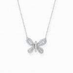 18K white gold diamond butterfly necklace with baguette and round diamonds.