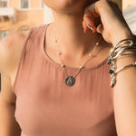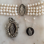 Sterling silver Miraculous Medal pendant on silver chain with freshwater pearls. This coin size is roughly the size of a quarter.