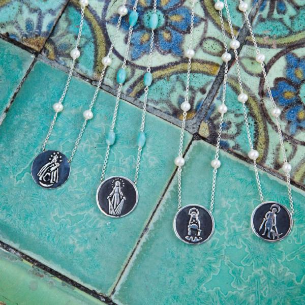 Sterling silver Virgen Milagrosa pendant on silver with fresh water pearls. This coin size is roughly the size of a quarter.
