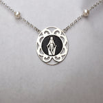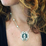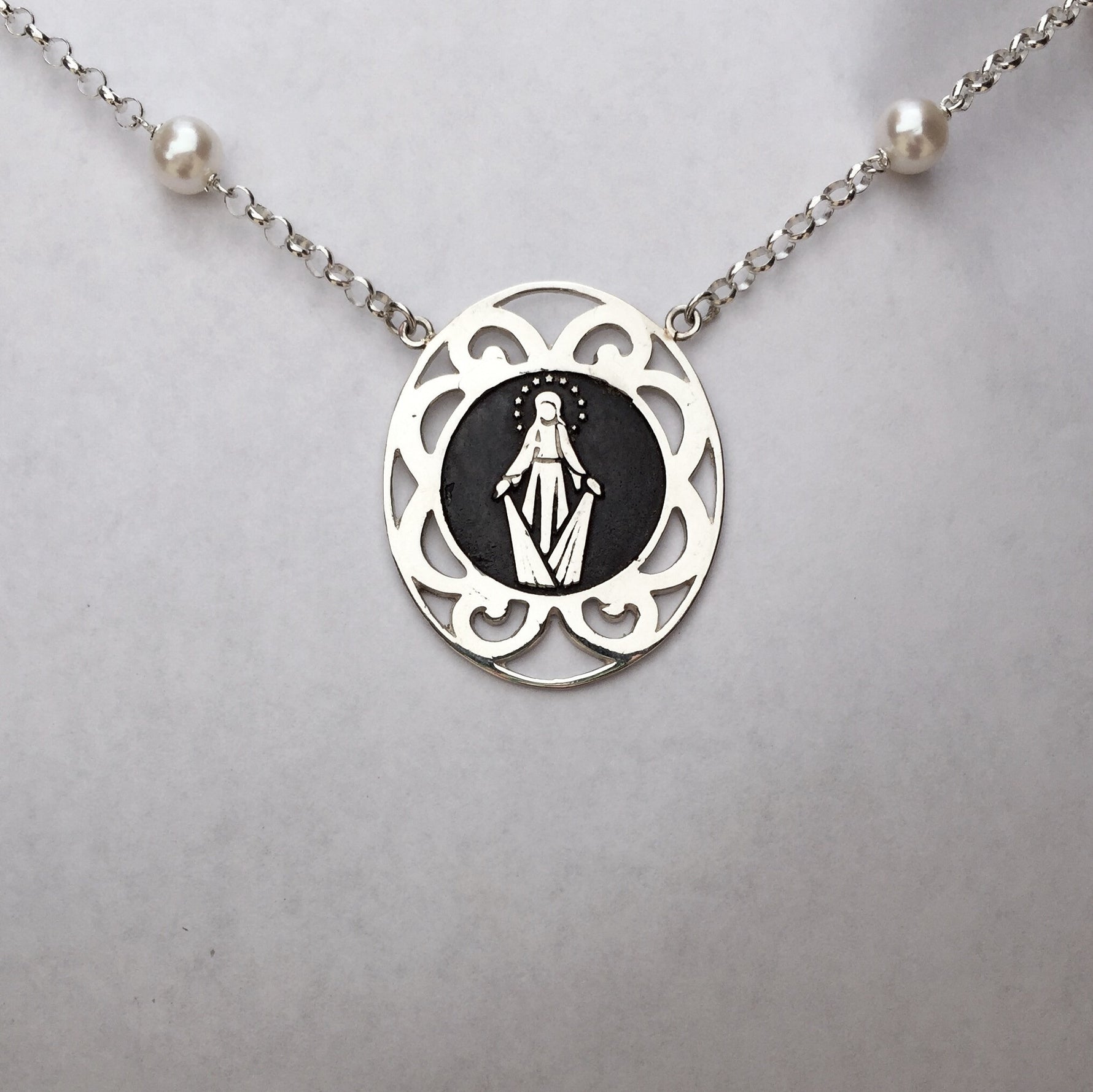 Sterling silver and freshwater pearl necklace featuring Santayana original Milagrosa design medal.