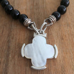Sterling silver cross with hand-cut mother of pearl inlay.