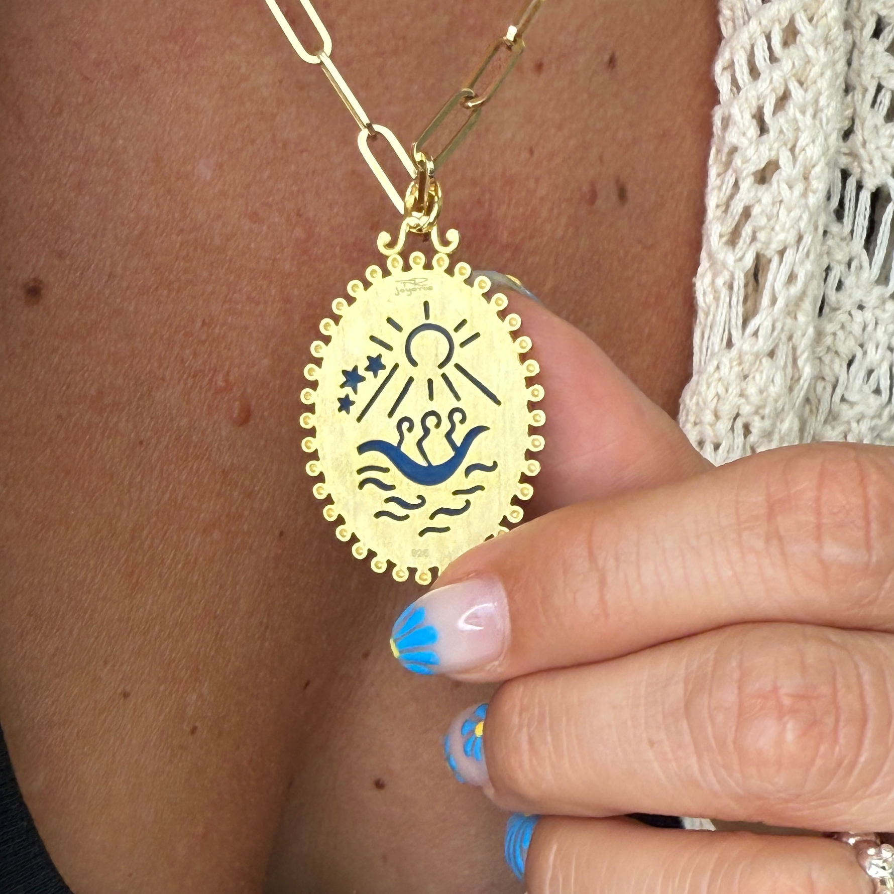 Our beloved Virgencita de la Caridad del Cobre comes to life in glowing bicolor agate, a piece that blends faith, artistry, and heritage. A collaboration that feels both sacred and artful, this pendant unites Santayana’s beloved Caridad del Cobre design with Frank Ronay’s signature hand-carved agate, transforming devotion into fine art. The blue-and-white cameo is luminous and serene, carved in agate that seems to glow from within, capturing the calm strength of Cuba’s patron saint.