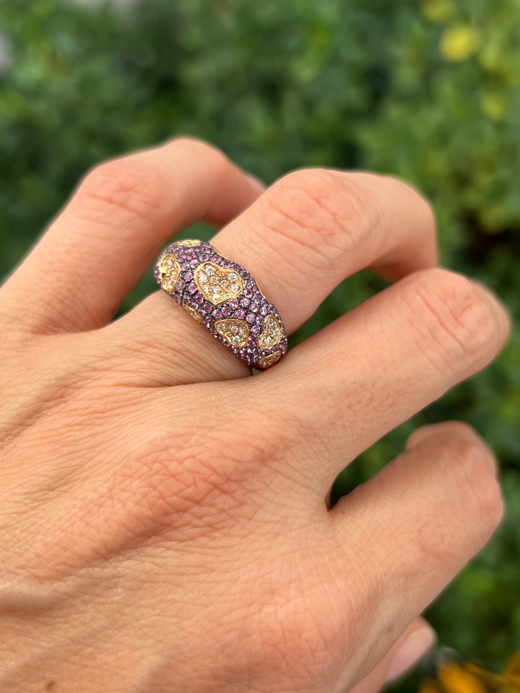 Floating pave diamond hearts adorn this whimsical ring against a pink sapphire background. Finished inside with a playful hearts gallery.
