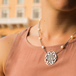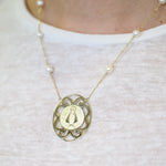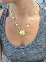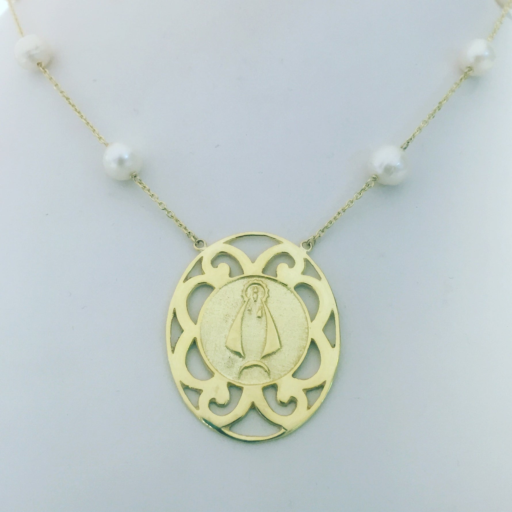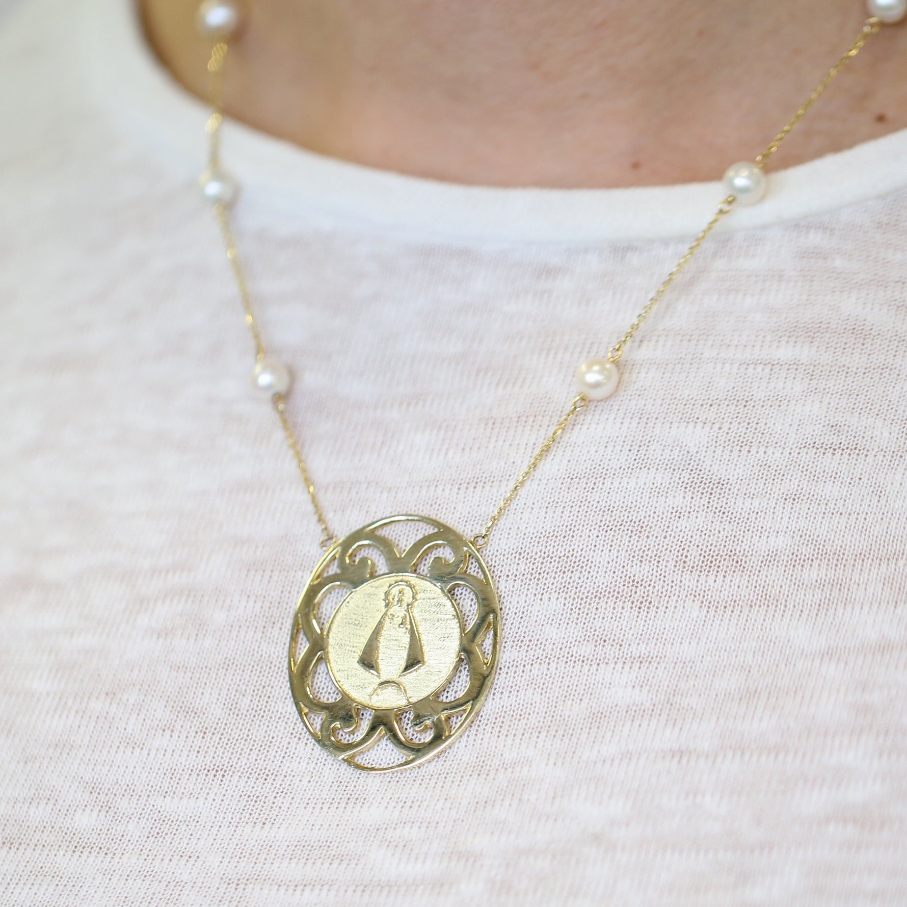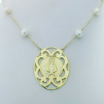 14K Yellow Gold Caridad del Cobre necklace with freshwater pearls.