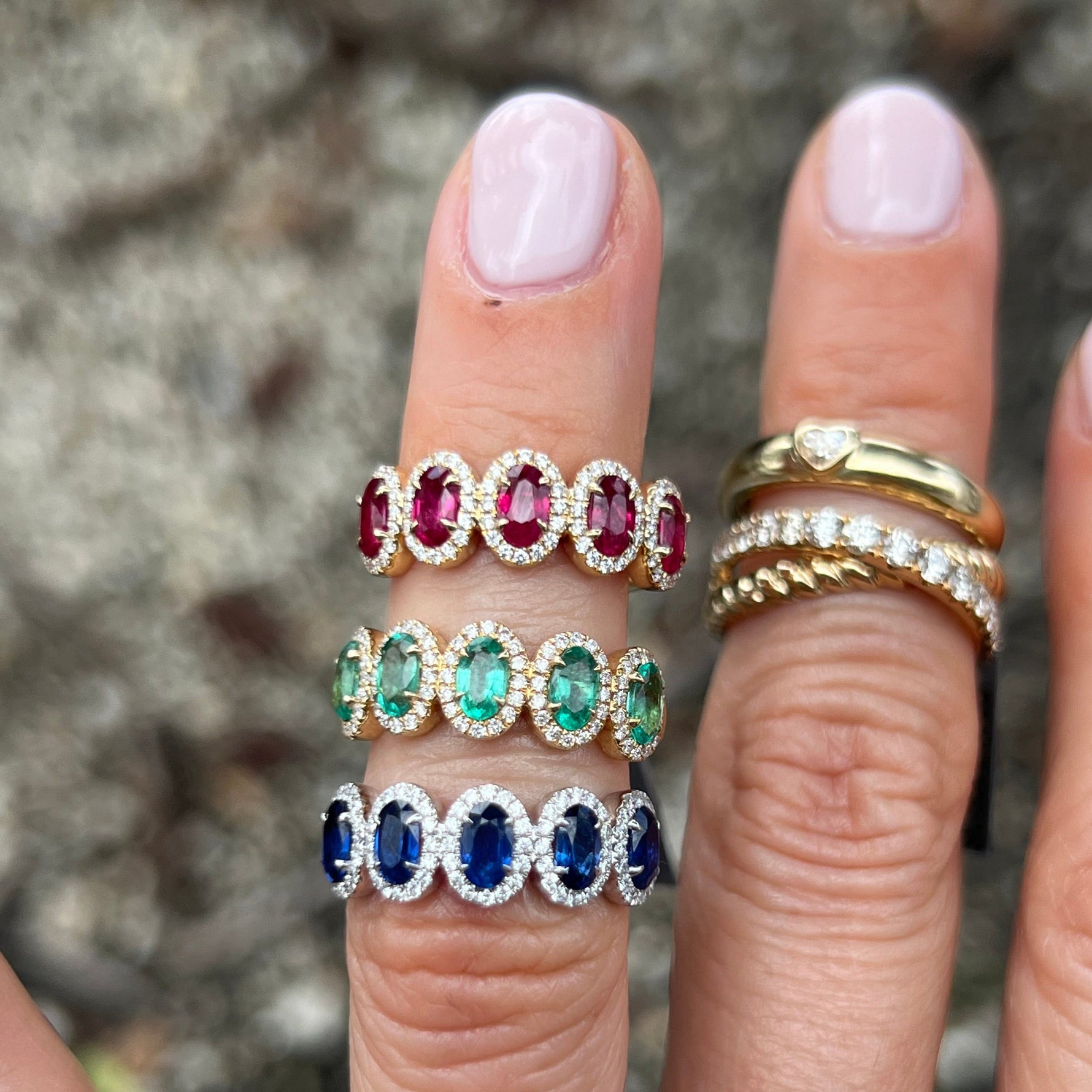 14K yellow gold ring with 5 oval emeralds set in diamond halos.
